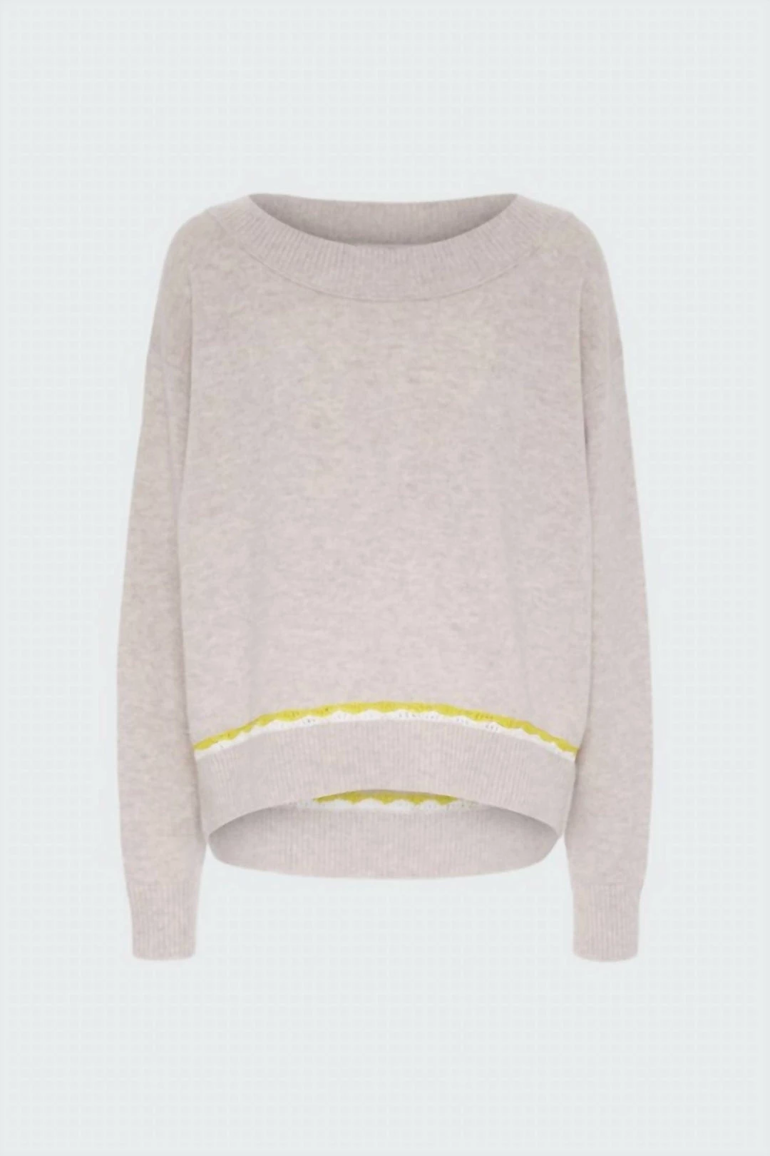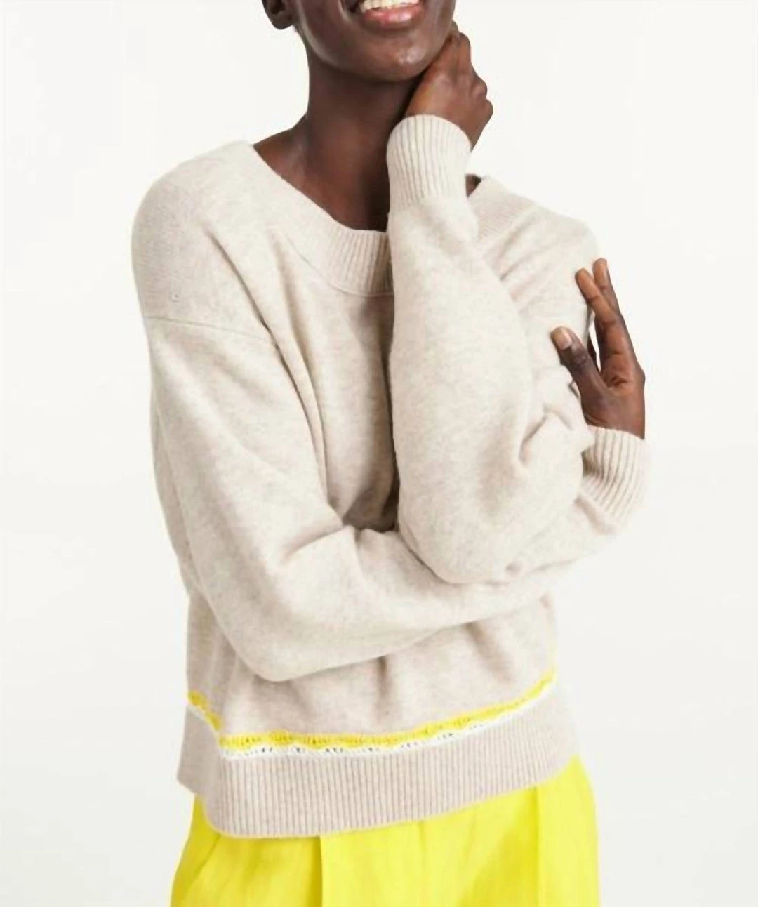 COZY UP IN THIS CASHMERE INFUSED WOOL SWEATER FROM DOROTHEE SCHUMACHER. THIS RELAXED FIT PULL OVER FEATURES LONG SLEEVES WITH DROPPED SHOULDERS, A WIDE ROUND NECK, RIBBED TRIM DETAILS, SLIGHTLY LONGER BACK AND A BRIGHT YELLOW CROCHET KNIT TRIM ADDS A SPORTY YET FEMININE FINISH TO THE TOP. ADD TO YOUR COLLECTION TODAY!