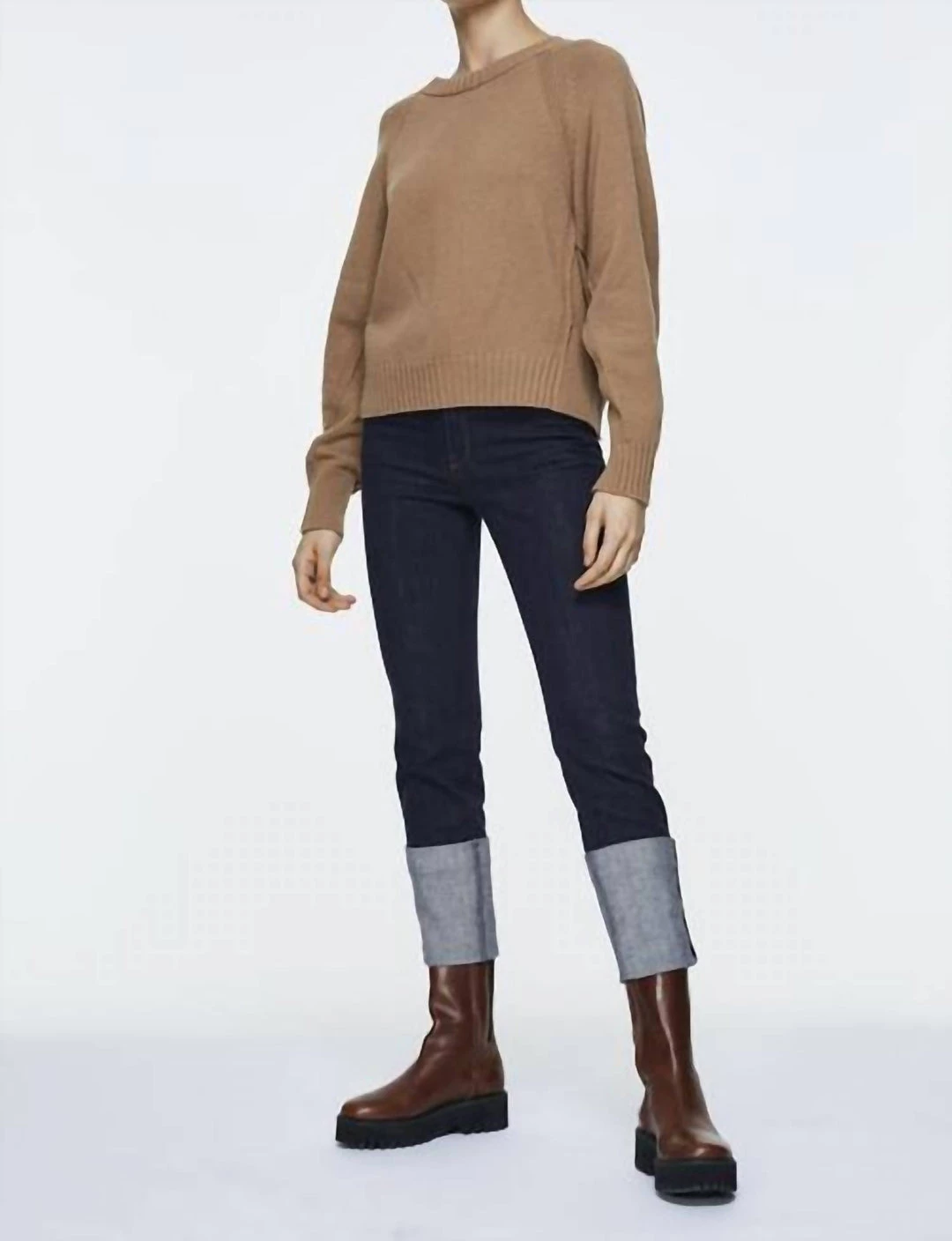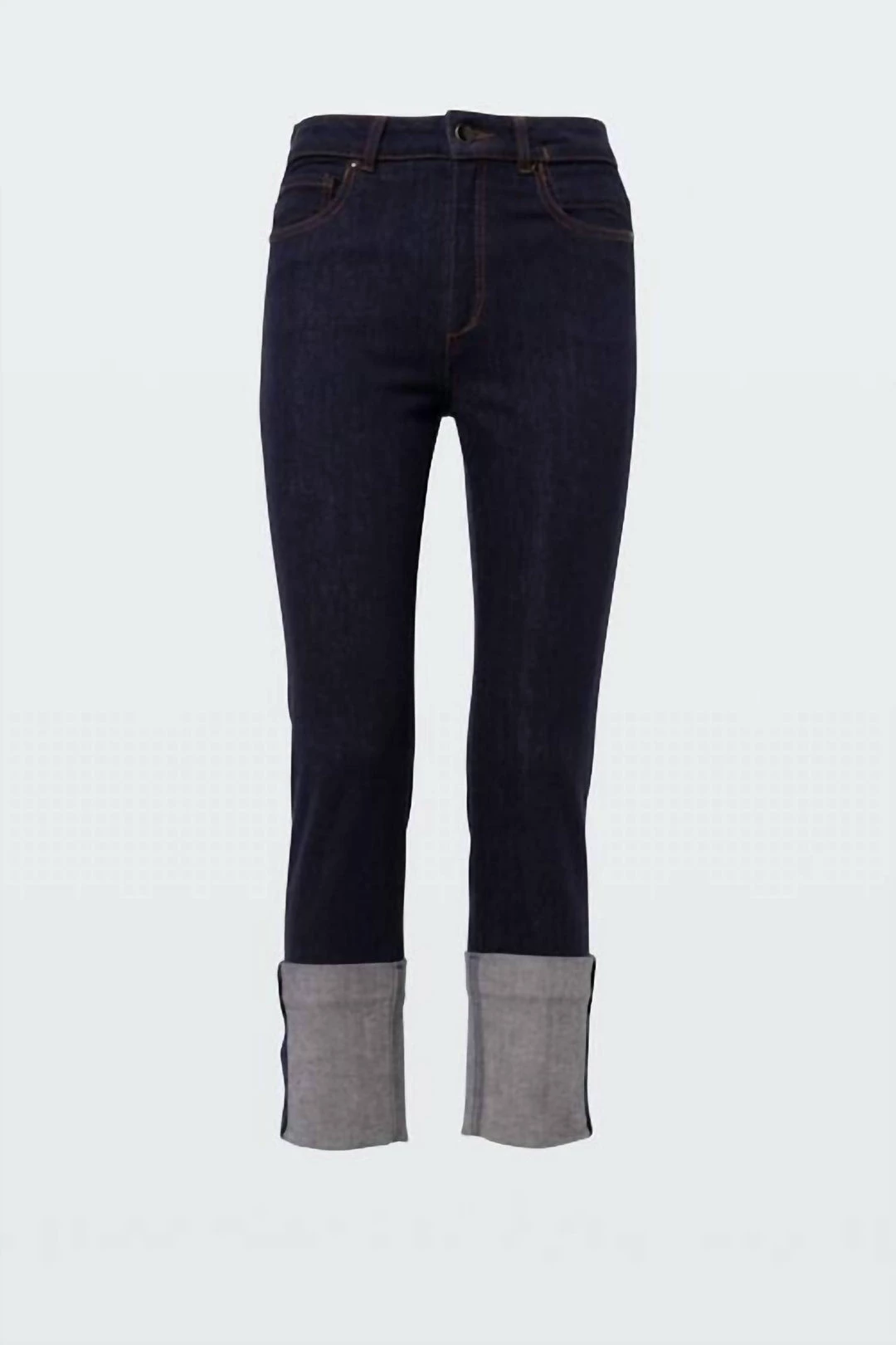 SHOW OFF YOUR STYLE IN THIS TRENDY PAIR OF DENIM FROM DOROTHEE SCHUMACHER! THESE PANTS FEATURE A CROPPED ANKLE LENGTH WITH A FIXED CONTRASTING TURN-UP CUFF, STATEMENT BUTTONS, CONTRASTING STITCHING AND A SLIM, FIGURE FLATTERING FIT. PAIRED WITH AN OVERSIZED SWEATER AND BOOTIES FOR A CHIC COLD WEATHER LOOK.