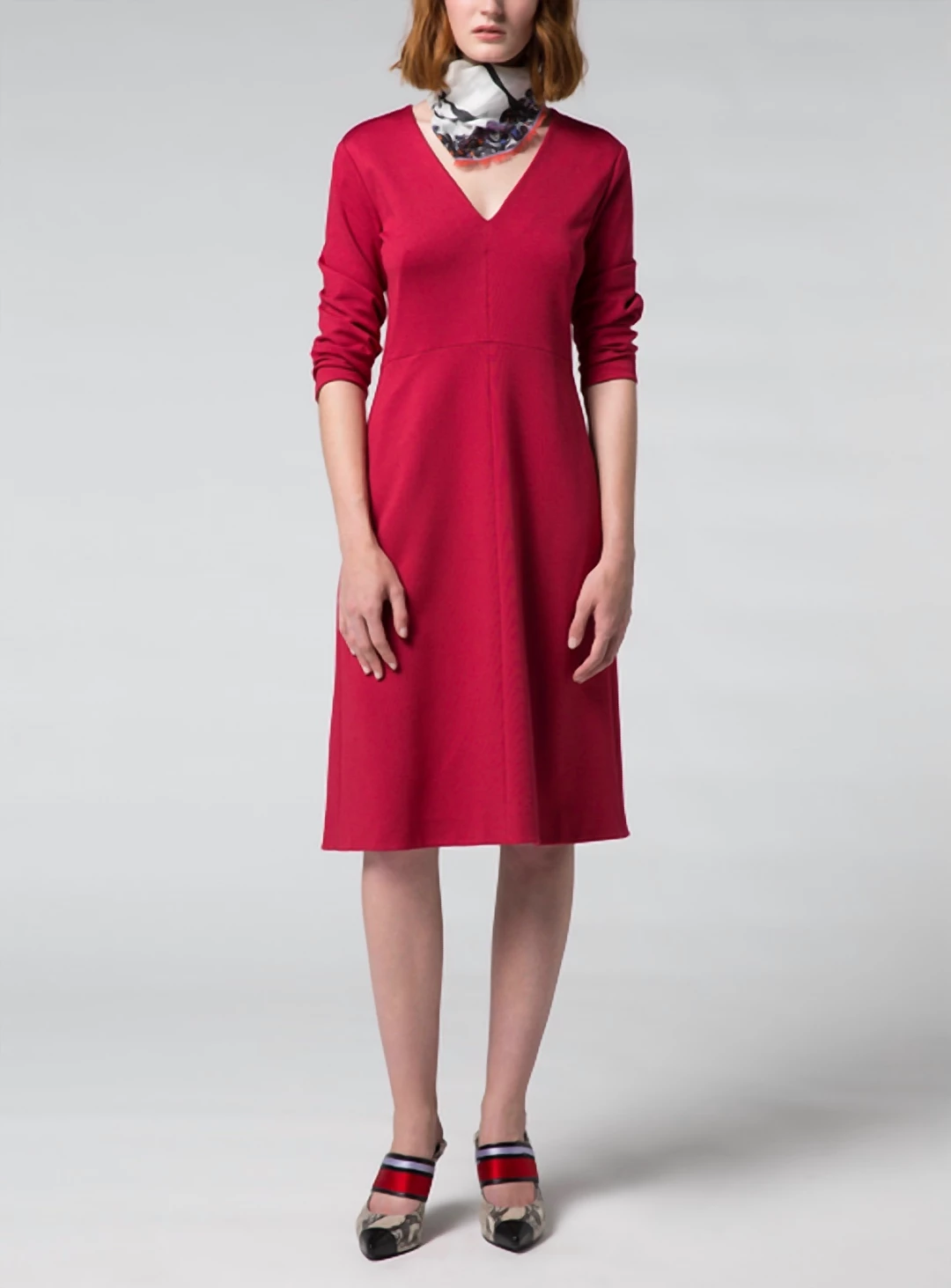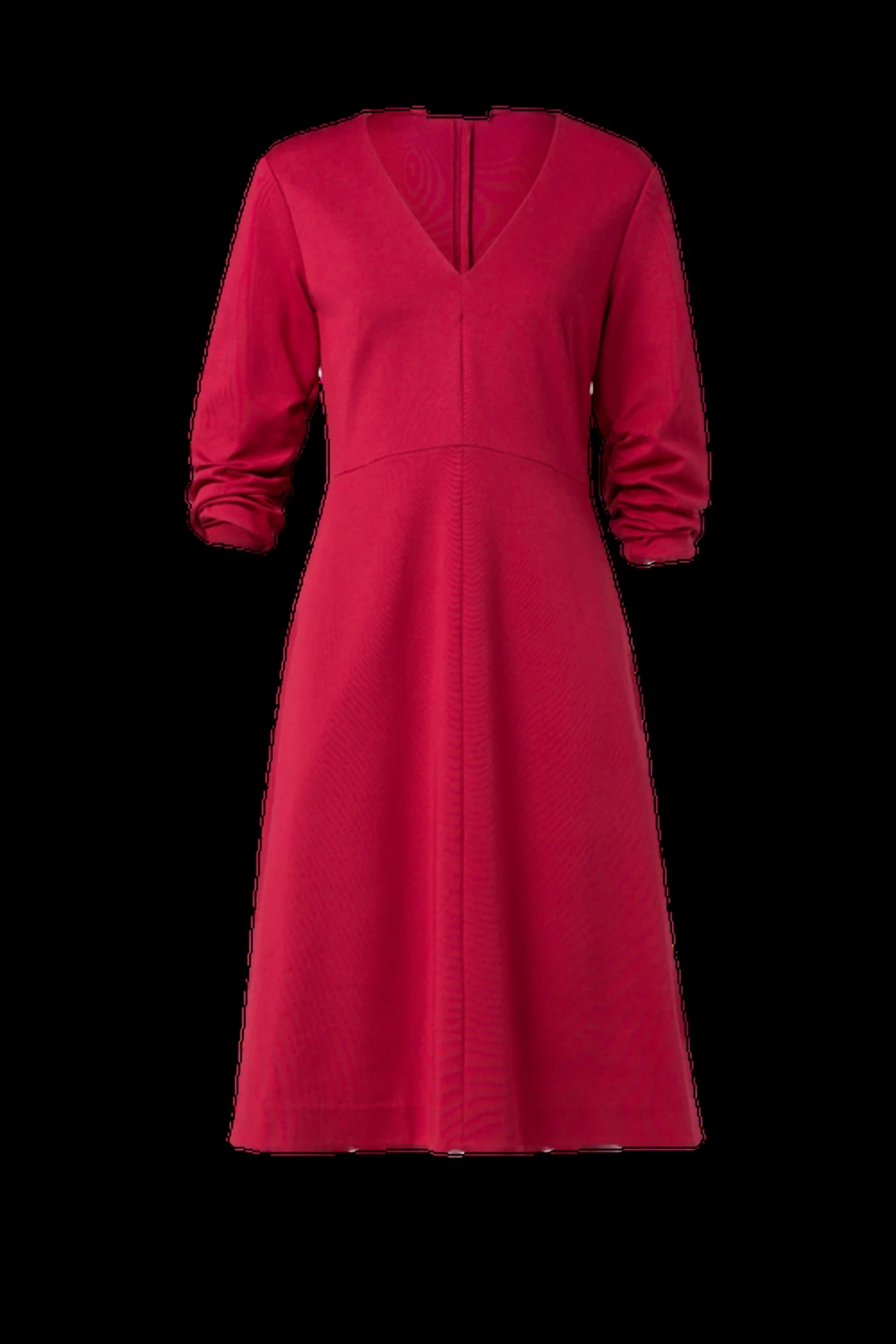 A PUNTO MILANO V-NECK DRESS IN A VERY FIGURE-ACCENTUATING SILHOUETTE WITH GATHERED DETAILS IN A STUNNING BERRY-RED HUE.