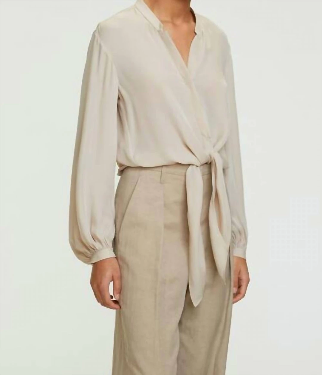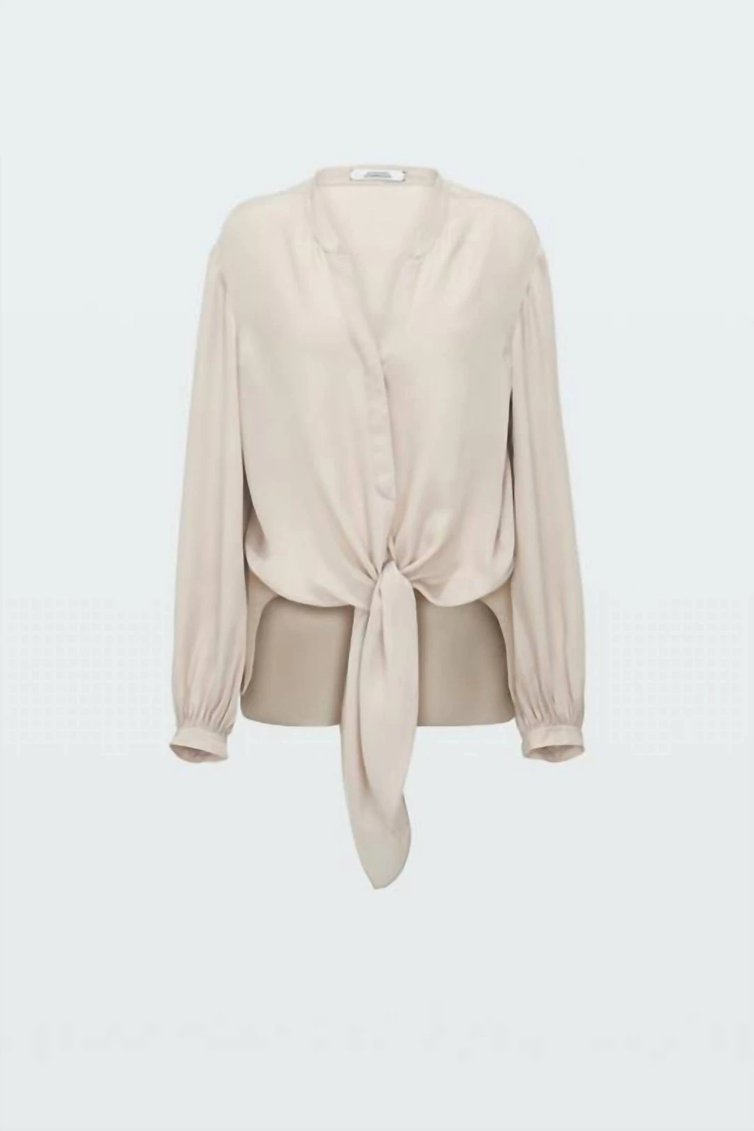 THIS CLASSIC BLOUSE FROM DOROTHEE SCHUMACHER GETS A REINTERPRETATION THIS SEASON. FEATURING VOLUMINOUS SIGNATURE SLEEVES, KNOTTED FRONT, OPEN V-NECKLINE WITH BAND COLLAR AND ASYMMETRIC HEM FOR AN EXCITING SILHOUETTE. PERFECT ON ITS OWN OR PAIRED WITH A BLAZER OR CARDIGAN FOR A TRULY FABULOUS LOOK.