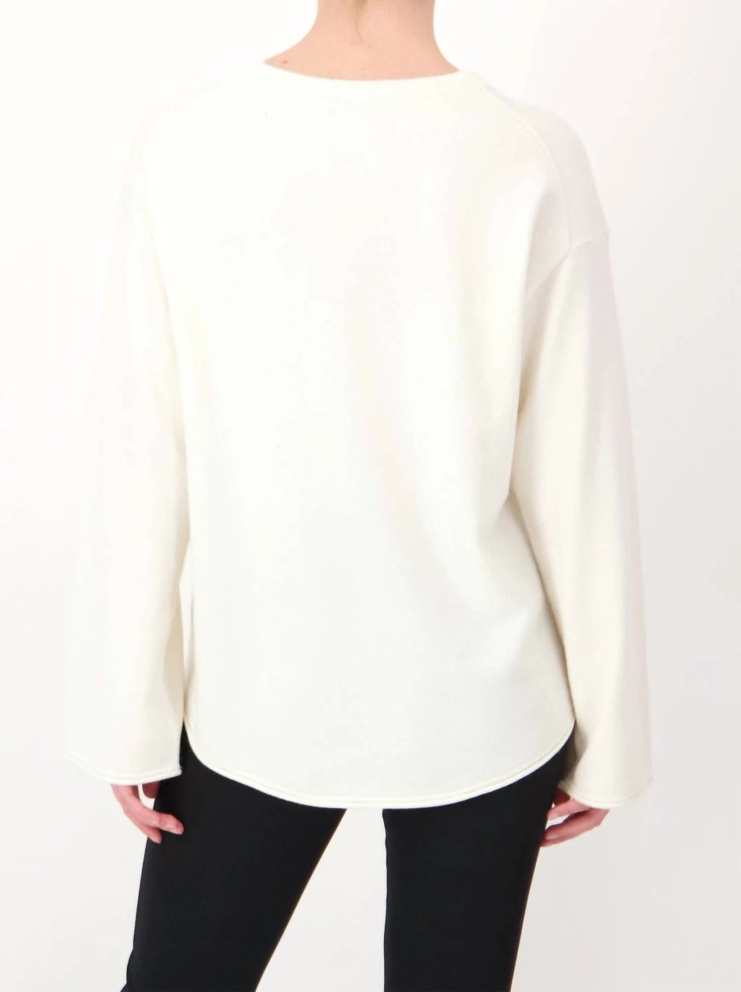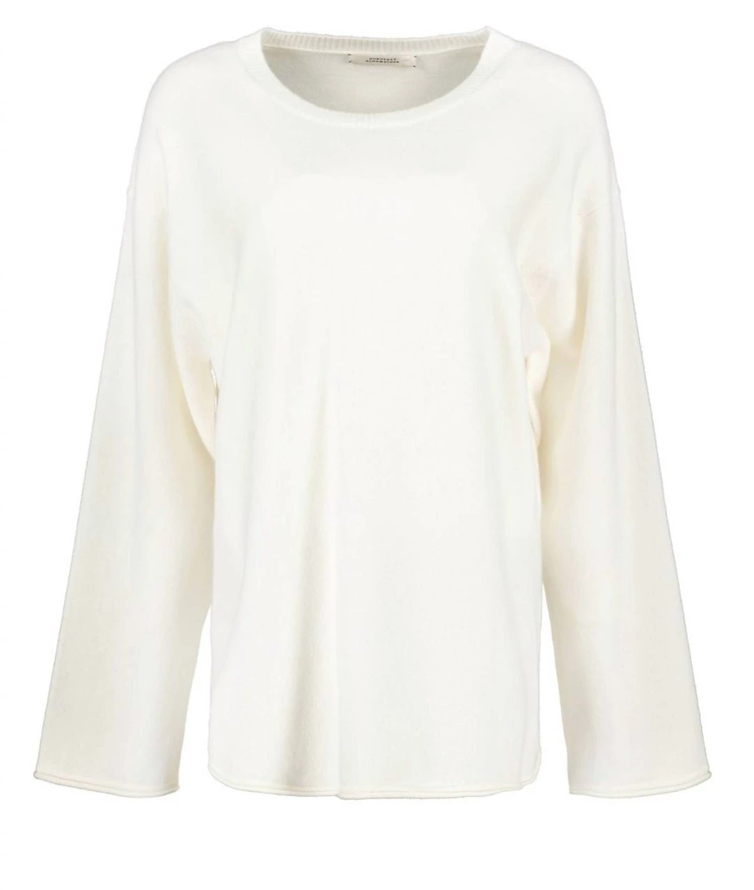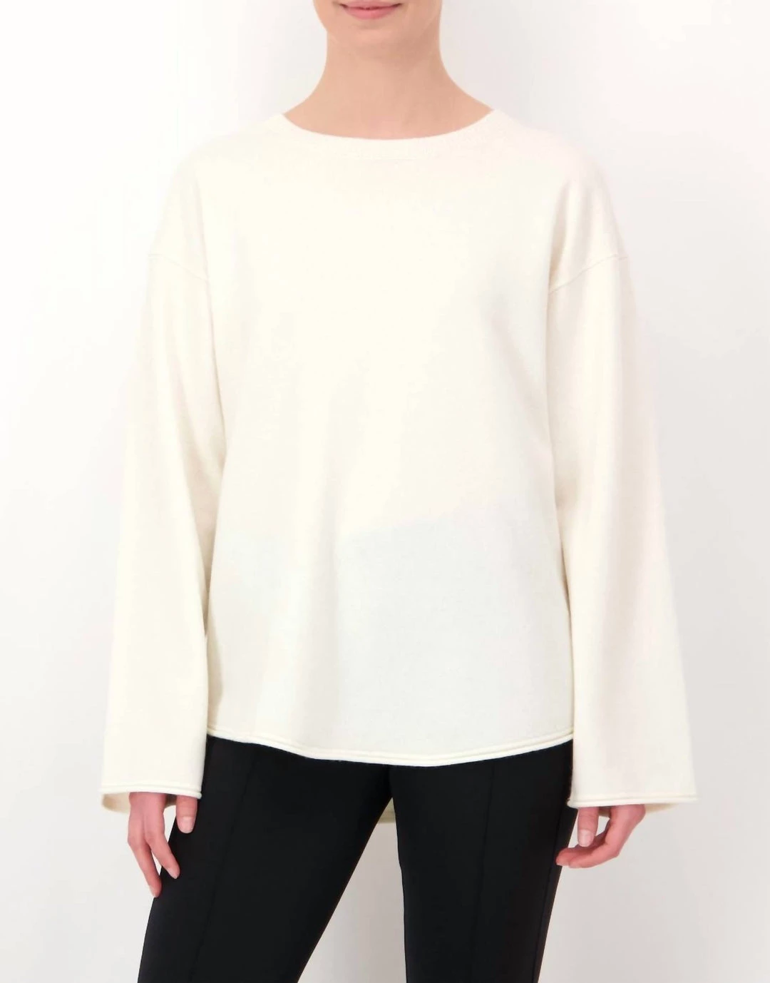 Round neckline. Dropped shoulders. Wide sleeves. Longer at the back than at the front. Rolled hem edge