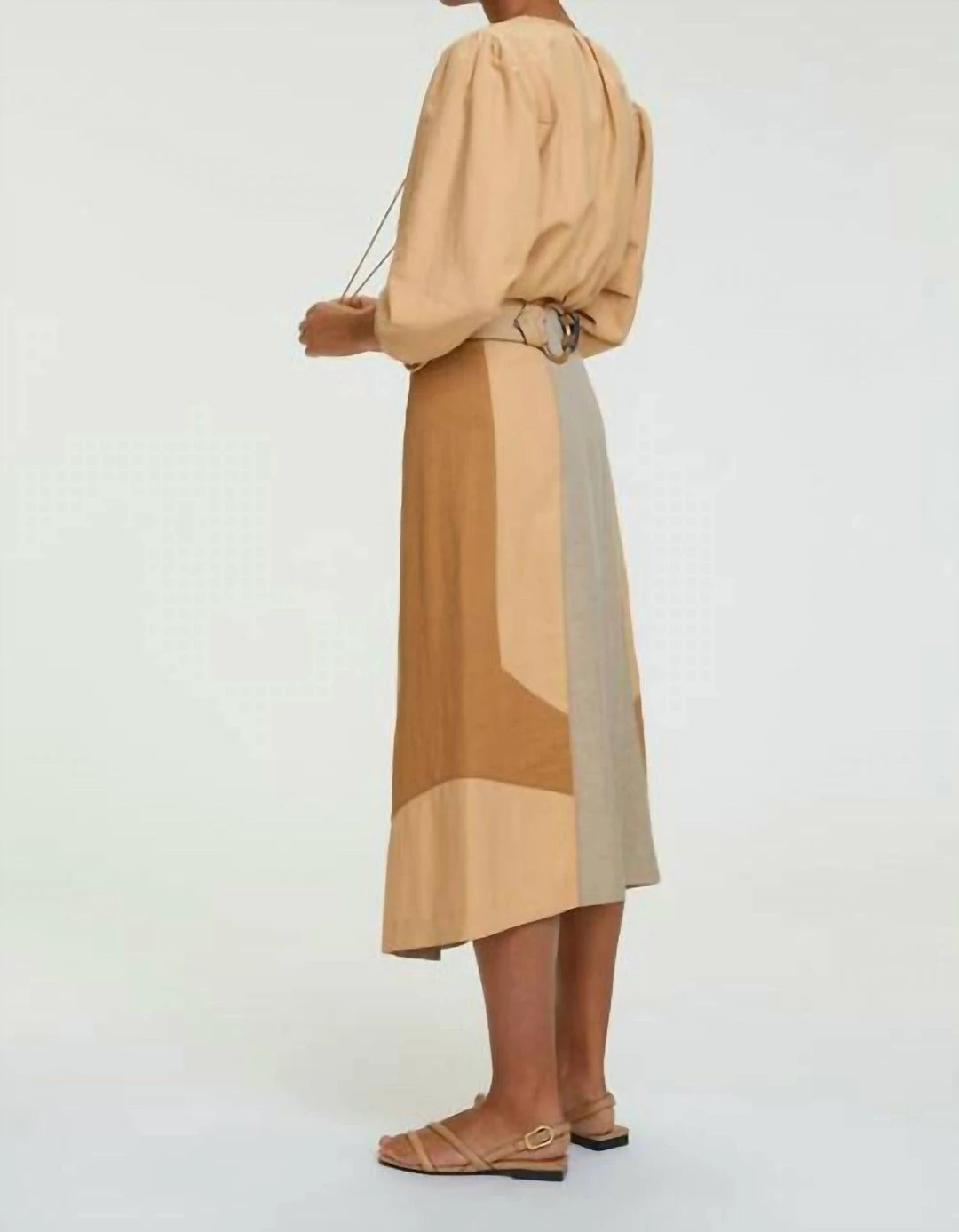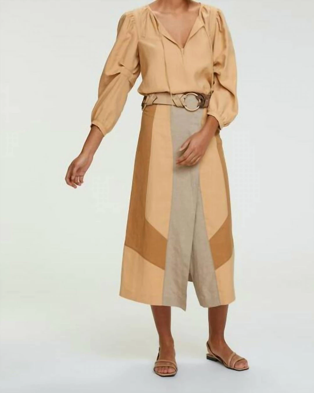 INDULGE IN A SUMMER FAVORITE WITH THIS PATCH SKIRT FROM DOROTHEE SCHUMACHER. THIS DELICATE EARTH COLOR WRAP SKIRT FEATURES A MID LENGTH HEM AND A HIDDEN BUTTON STRIP TO MAXIMIZE THE STYLING VERSATILITY. ADD A BIG BELT AND BOHO LIKE BLOUSE TO COMPLETE THE WARM WEATHER LOOK.