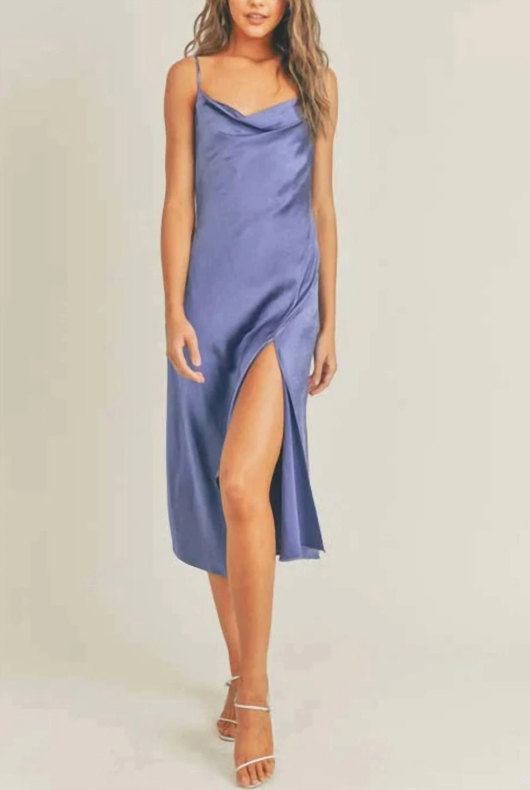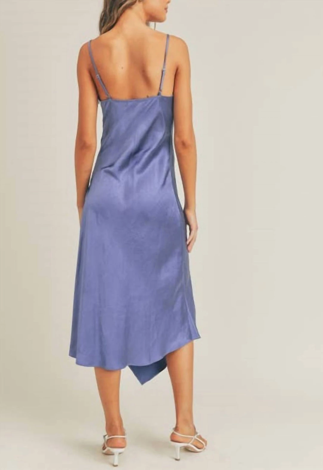 Satin Blue Cowl Neck Midi Dress by Lush Clothing. Features Adjustable Cami Straps, Side Slit, and Handkerchief Hem.