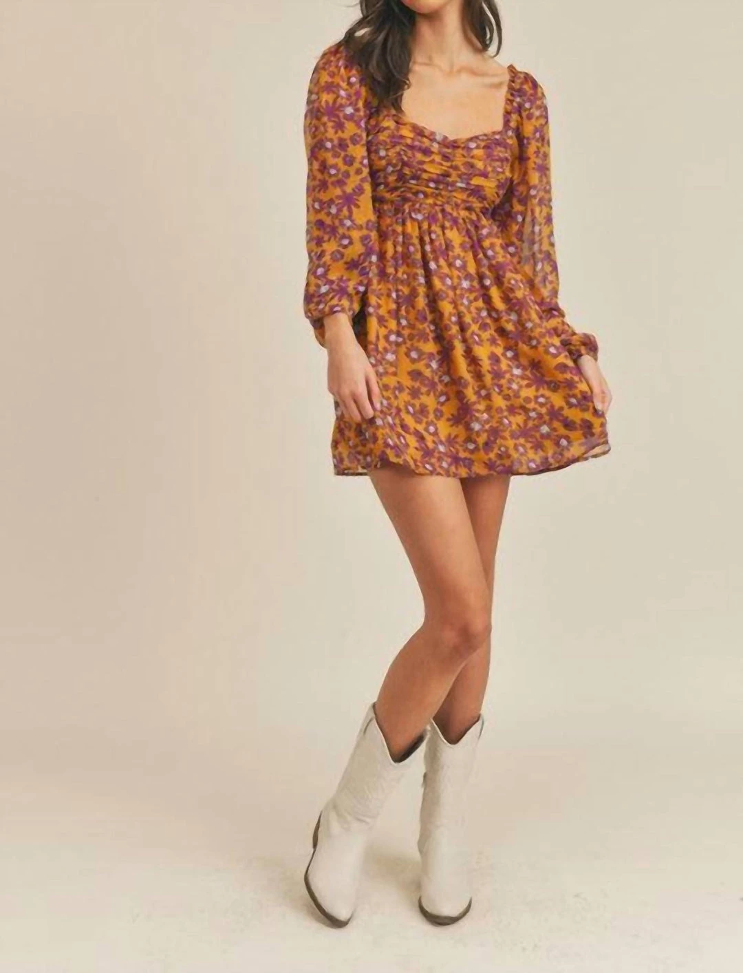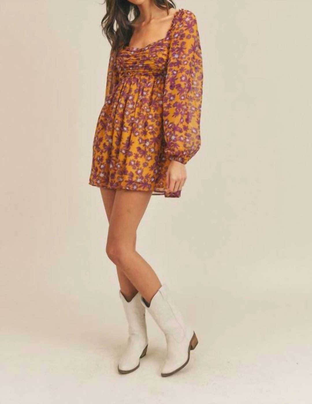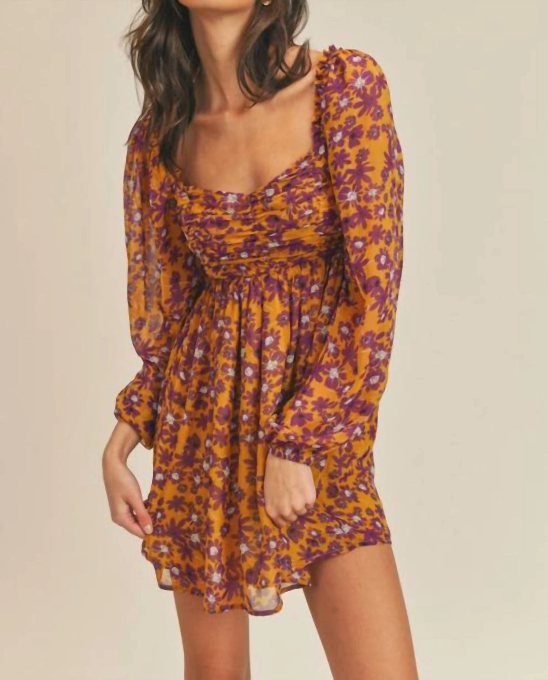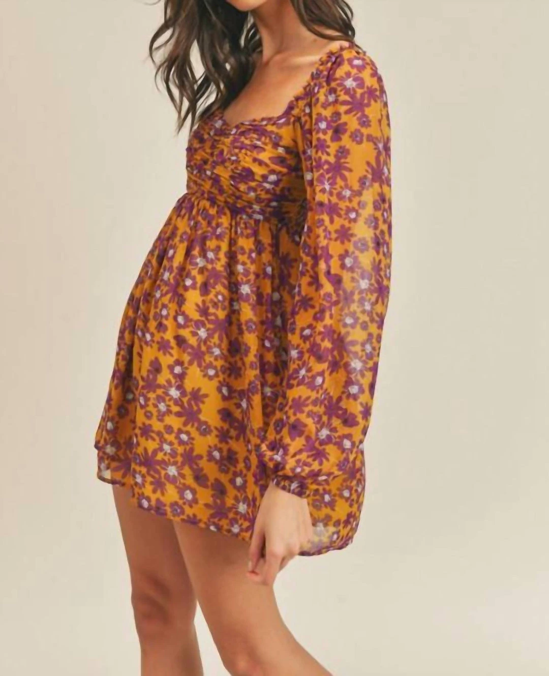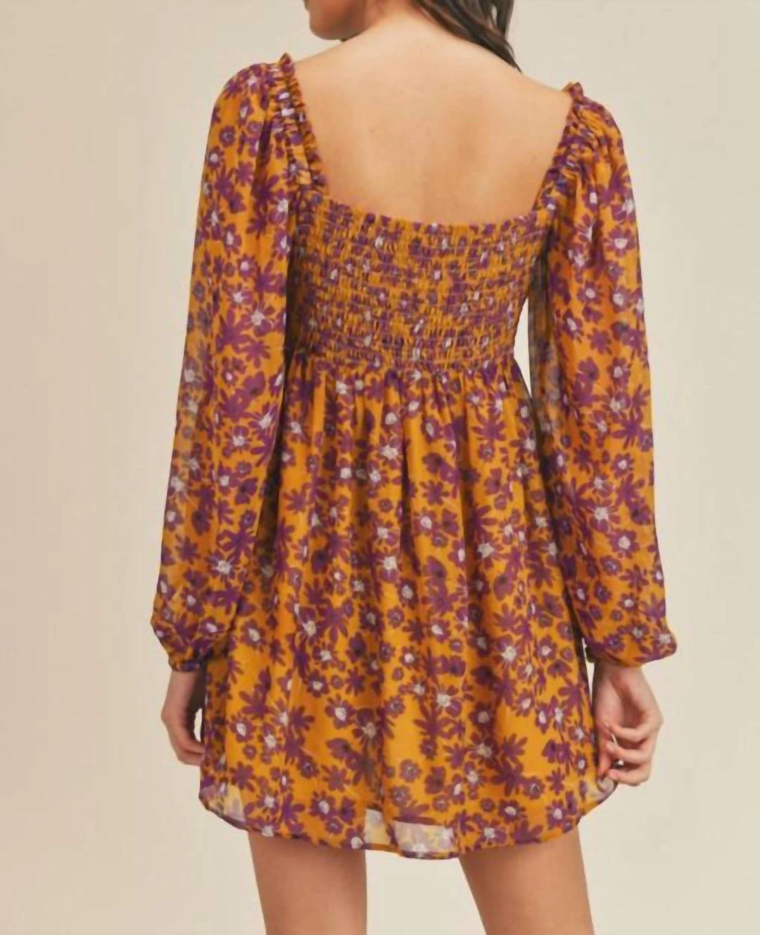 Hot Sale π Lush π© women Smocked Floral Print Mini π Dress in Mustard Violet β